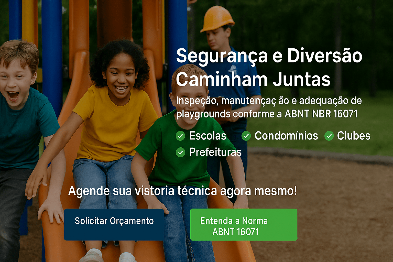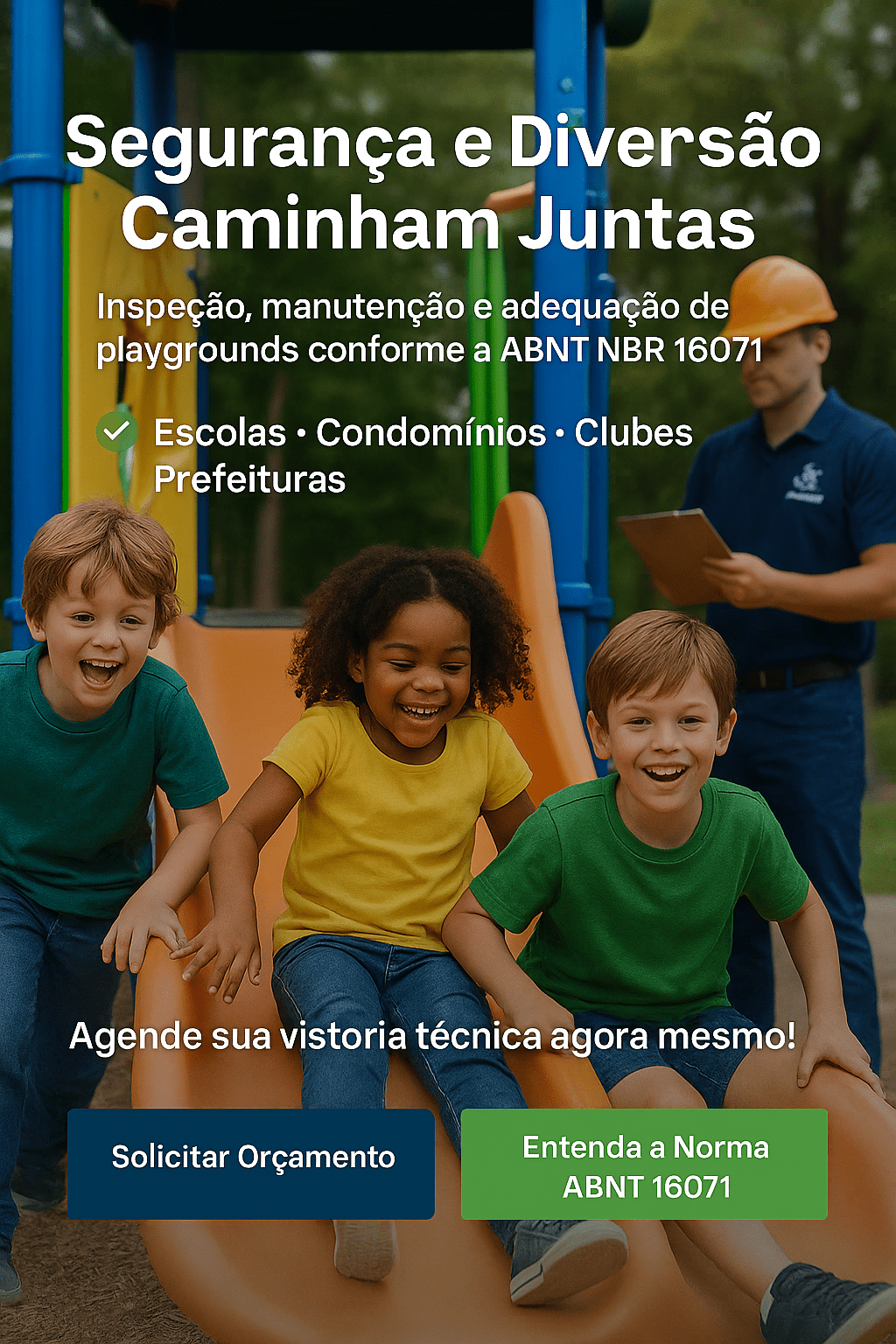A Previna Play nasceu com um propósito claro: garantir que a alegria das crianças em playgrounds esteja sempre acompanhada de segurança, responsabilidade e qualidade técnica. Atuamos com inspeção, manutenção preventiva e corretiva, emissão de laudos técnicos e adequações conforme a norma ABNT NBR 16071, atendendo escolas, condomínios, clubes e prefeituras em todo o Brasil.